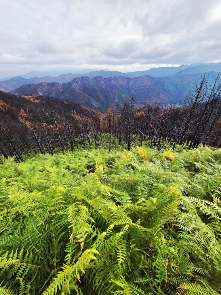 Uz kādu brīdi savilkās migliņa un šķita, ka sāks līt, bet aiz pāris līkumiņiem jau atkal skaistas, zilas debesis un balti mākonīši. Te bija posmi, kur ir plosījušies lieli mežu ugunsgrēki, papardes bija atguvušas spēkus, izlauzušās cauri pelniem un atdzīvināja drūmo ainu ar savu salāt zaļo toni.