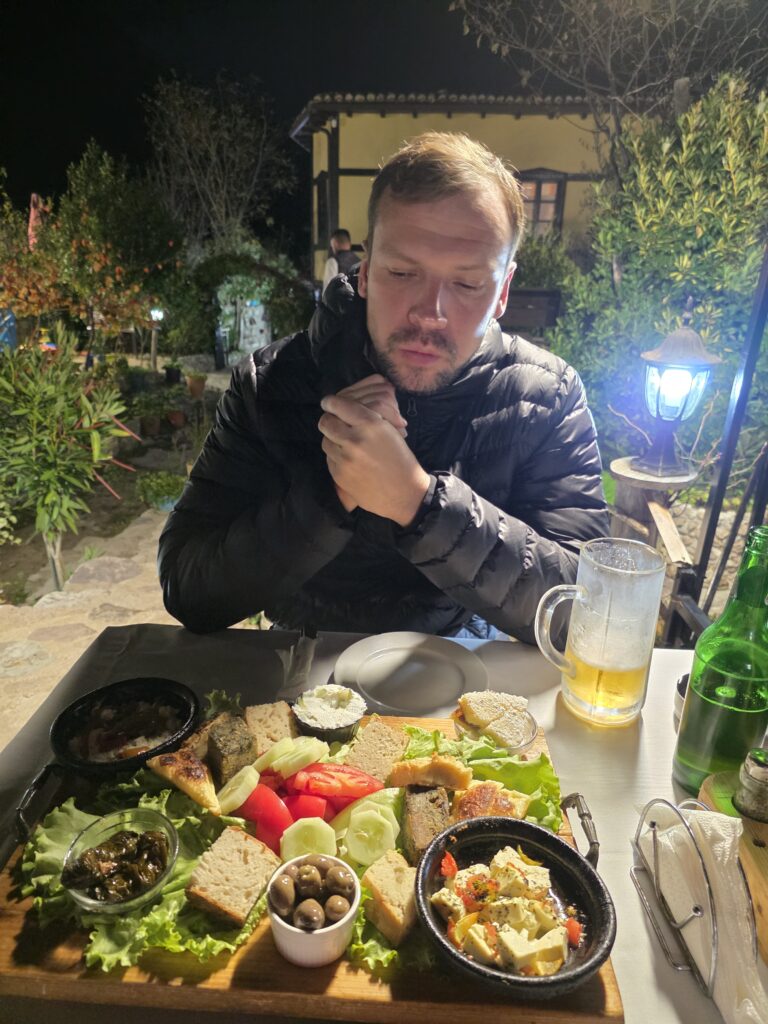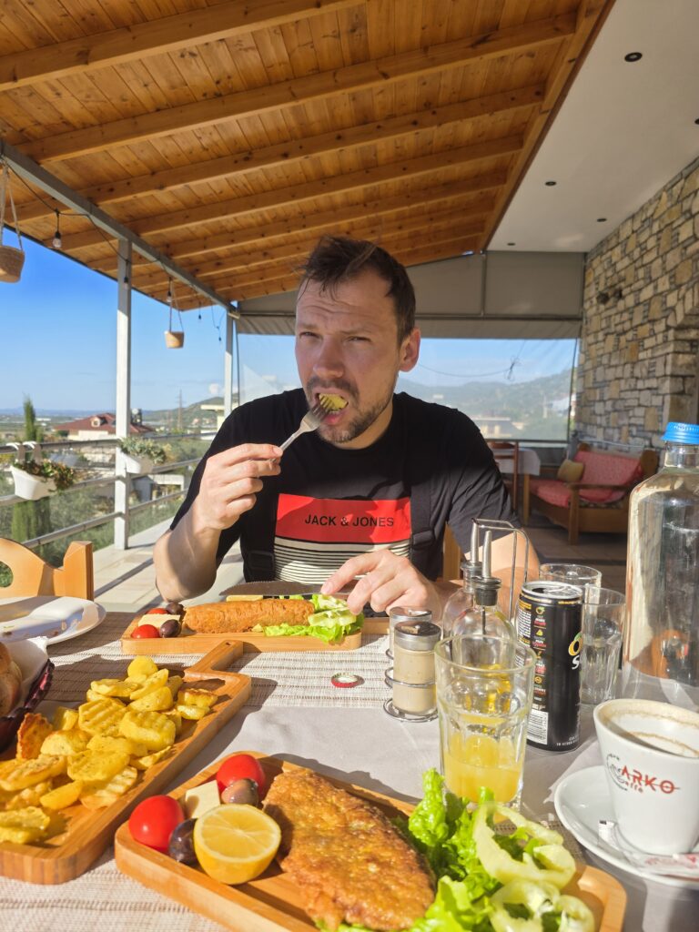 Labi, ka palikām pa nakti civilizācijā, lietus bija tāds, ka elektrība, pa nakti beidzās, lietus lija tā, ka šķita tā upe būs pārplūdusi, bija skaļi, pat viesnīciņā brīžiem bija bail. Te gan jauki mūs pabaroja, tās vakariņas bija bagātīgas, pirmā diena Albānijā, tik garšīgi. Pie vakariņām, es lasīju rakstus par viņu ēdieniem, viesmīlību, cik tas viņiem ir svarīgi uzņemt labi viesus.