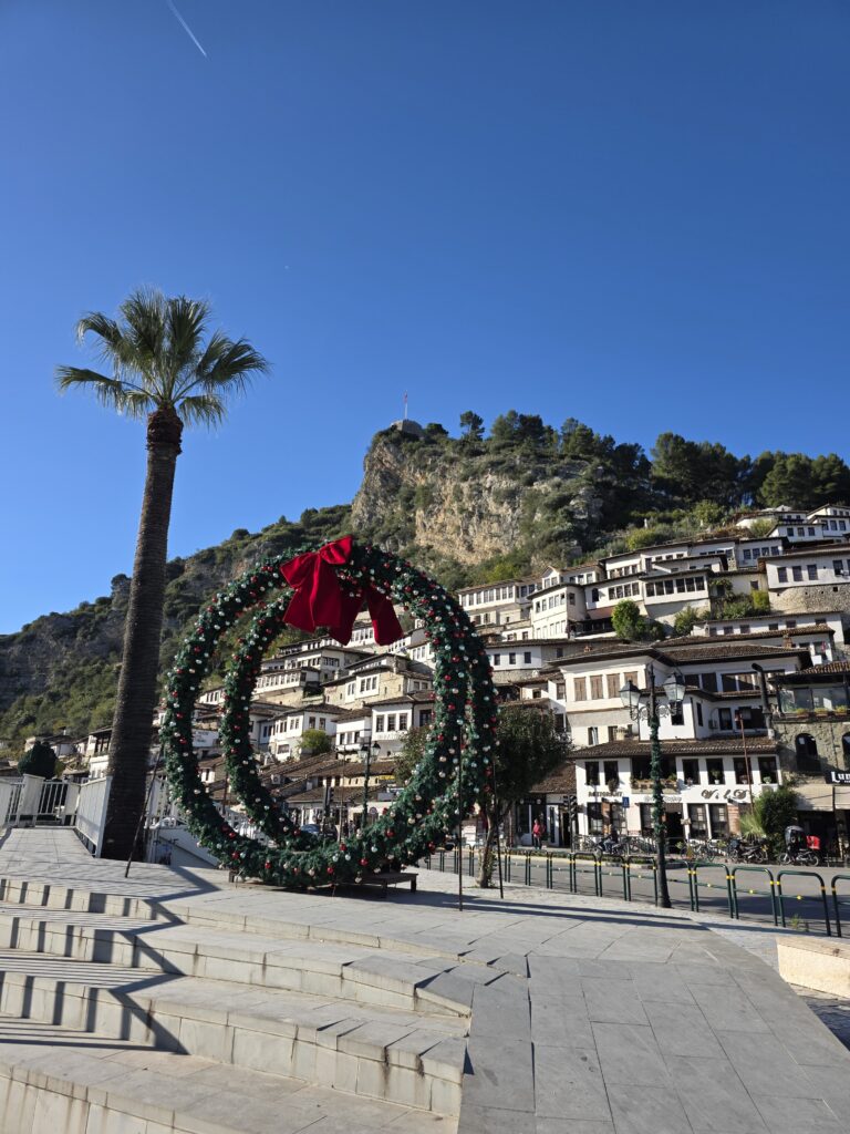 Ļoti, ļoti garšīgi un vēlāk atnāca meita, atnesa vēl vietējo, tradicionālo dārzeņu pīrāgu, tiešām, tik jauki ir albāņi😊. Papusdienojuši nobraucām arī uz pilsētas centru. Te jau cilvēki izlikuši ziemassvētku dekorus, Laimes lāci un vainadziņus. Centriņš diezgan piepildīts ar cilvēkiem arī Tūristu daudz!!!. Te tik skaisti tilti un skats uz mājiņām, kas izskatījās, kā čiekuriņi, kuri salikti gar kalna maliņu.
