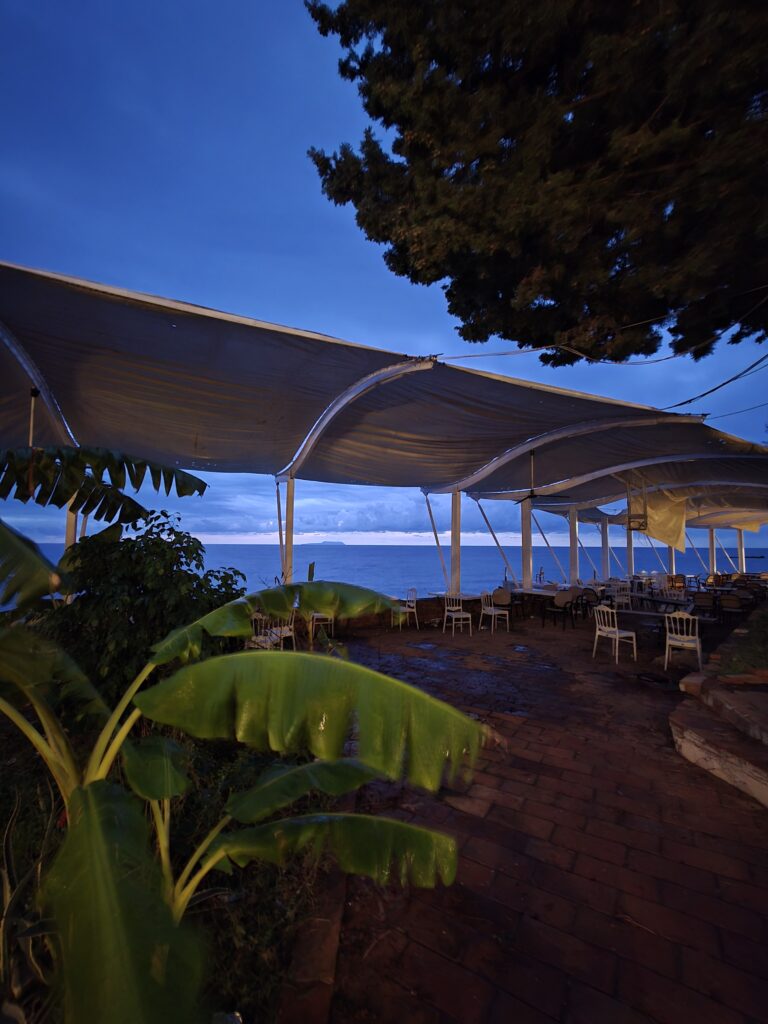 Blakus ir kemping laukumiņš, protams pa vienkāršo un būdiņas no palmu lapām. Es uzjautāju tam saimniekam, vai tajās var palikt, viņš saka, ka var jau 10 E un droši. Kāpēc vispār to jautāju, jo tumsa ir klāt un nav kur palikt. Bet mani māca šaubas vai varētu nenosalt un cik silta nakts, arī vistas un pīles visu laiku rušinās ap tām būdiņām.