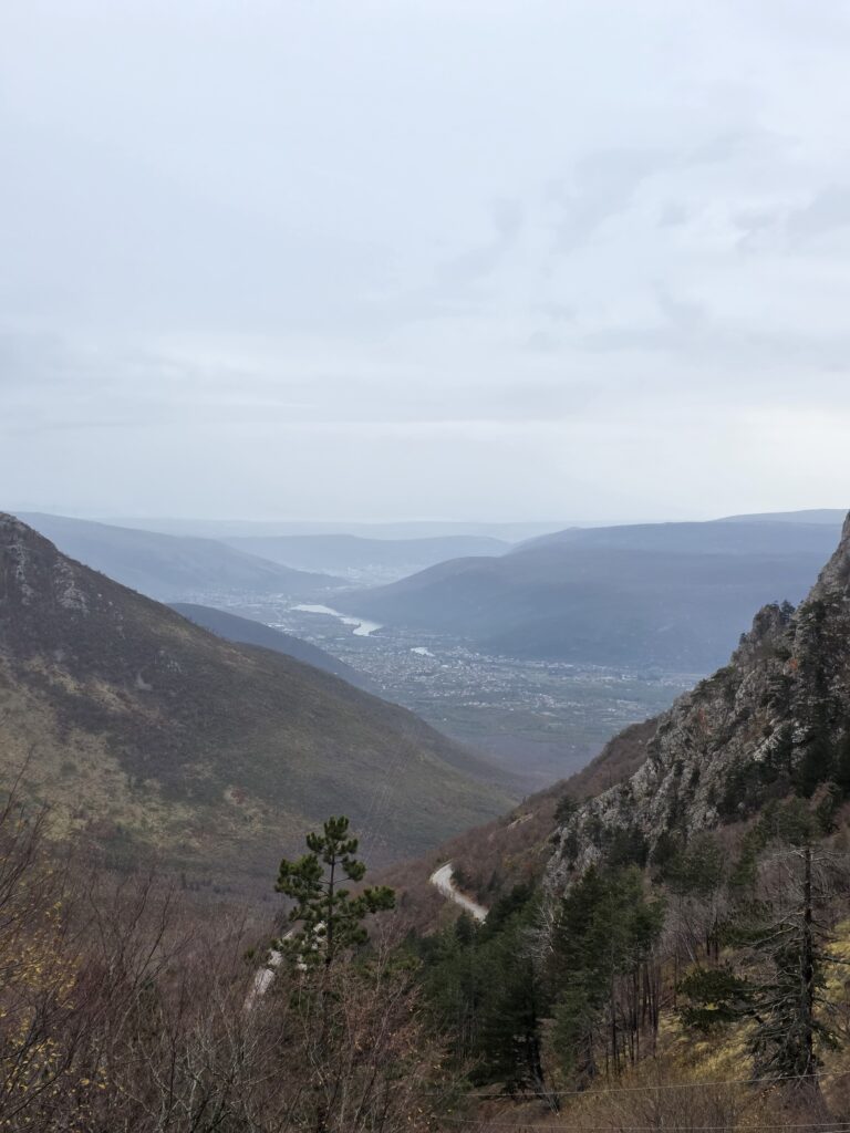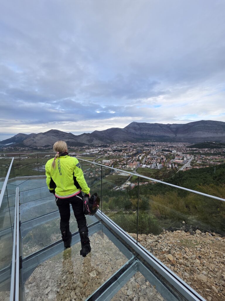 Dodamies noķert skatu pāri pilsētai un ielejai uz skaistu skatu punktu. Brauciens cauri visai pilsētai, tad arvien mazākās piepilsētas ieliņās un jau esam uz zemenītes, kur ceļš mūs ved kalnā. Skatu punkta balkoniņš bija izaicinājums, tās stikla grīdas, tomēr prātam neļauj līdz galam ticēt, ka viss droši. Skats pavērās plašs un brīnišķīgs uz TREBINJE pilsētu, pat ar visu to, ka nedaudz apmācies.