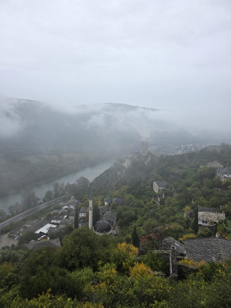 Ierodamies, POČITELJ pilsētā, viss ir lietū ietīts, dūmakains. Kā es saku, tieši laikā ieradāmies spoku pilsētiņā. Patiesībā šī ir viena no skaistākajām vēsturiskajām pilsētiņām, kas atrodas Bosnijā un Hercegovinā. Te ir ļoti šauras ieliņas, akmens mājas, mazi dārziņi, lielas koka durvis un vārti, un arī cietoksnis. Pilsētiņa ir stāva krasta nogāze ar skatu uz NERETVAS upi. Man šķita ļoti maģisks laiks kurā te bijām, lietus piestāvēja šai vietai.