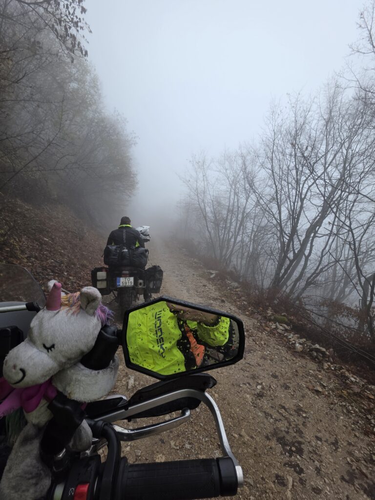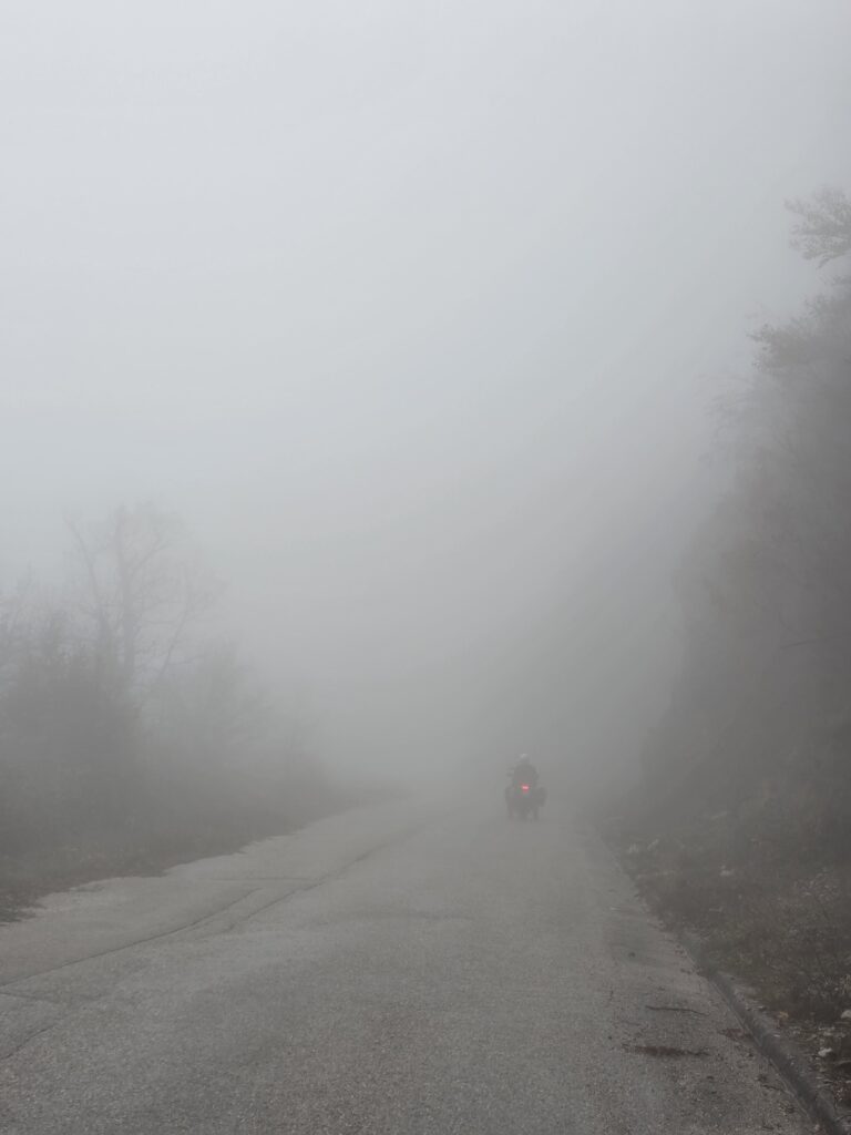 Tā mēs te pus dienu līkumojuši, redzam, ka mocīšiem vajadzētu uzpildīties, jābrauc no kalniem ārā, jo te neizskatās benzīns pieejams😊. Uz lielākiem ceļiem jābrauc gliemeža ātrumā, jo ir kārtīgs ezītis miglā, neko nevar redzēt. Pēc kāda laikam esam atgriezušies gandrīz tur, kur vakar beidzām braucienu😊.