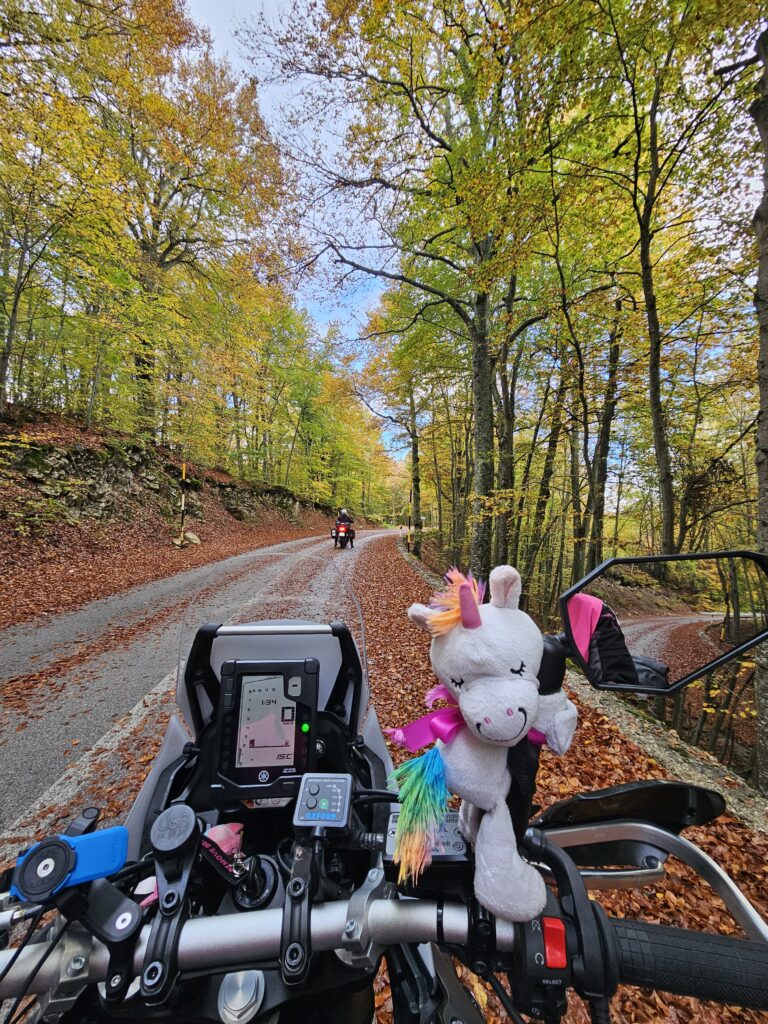 Tālāk devāmies pa maziem ceļiem, iekšā kalnu mežos – “Parco Nazionale dell Maiella”. Ak Dieniņ, tā bija maģija, milzīga migla, fonā dzirdam kaut kur gotiņas, kaut kur aitiņas un tad iznirstam no miglas. Apkārt pļavas, lapsas ruduma meži un milzīgi cukur vates mākoņi apskauj kalnu galotnes un mēs tam visam pa vidu. Lielā, stiprā saule mēģina izlauzties caur šo miglas un mākoņu jūru, dodot košākas krāsas rudenim.