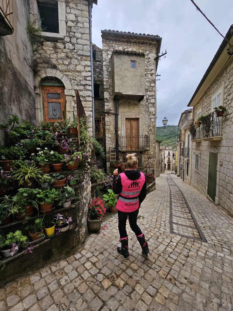 Tad mēs iesprūdām kalnu pilsētiņas laukumā, jo galīgi navigācija sajuka. Bet satikām baltu, pūkainu draugu, kas pavisam mūs negribēja laist projām. Iedzeram limonādi, paštukojam un nolemjam, ka jālaiž tik kādā mazajā ieliņā iekšā un kaut kur jau ārā tiksim. Vienīgi benzīna rezerves mums mirgo, vietējie saka, ka te tuvumā galīgi nekas neesot un pusdienās neviens nestrādā😊, to jau gan mēs labi zinām, ka Italy tā it:).