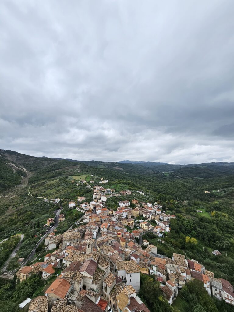 Tā garām vairākām baznīciņām un nomaldoties mini pilsētiņas šaurajās ielās, tomēr atrodam – “Belvedere di Pannadomo”- tik pasakains panorāmas skats, tālu, tālu… pāri visai pilsētiņai un apvārsnim. Var redzēt kā ir izbūvēts ceļš un pilsētiņa celta kalna virsotnē gar ceļu, skaistie baznīcu torņi un dakstiņu jumti mājiņām, tik kolosāla ainava.