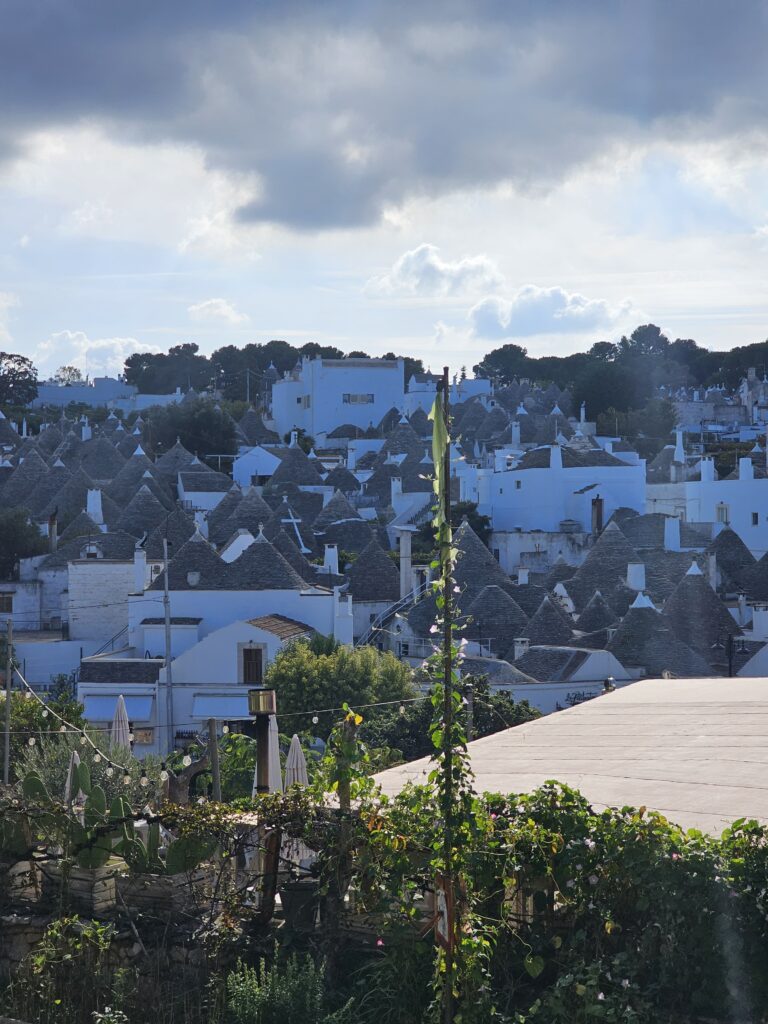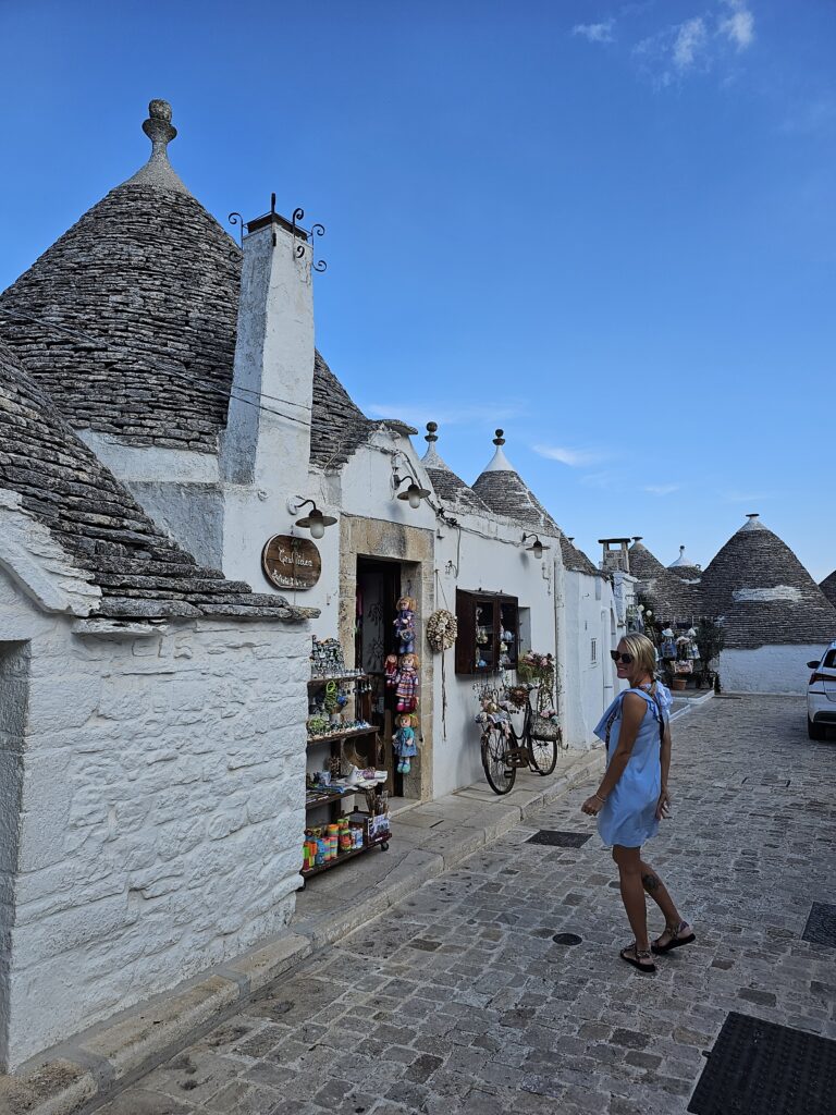 Nedaudz pabraukuši esam nonākuši – TRULLIS -īpaša tipa ciemats ALBEROBELLO. Te visas mājiņas ir baltākas par baltu un tumši pelēkiem jumtiem, kas izskatās pēc rūķu cepurēm. Vispār ir sajūta, ka esam nonākuši “smurfu” ciematiņā.