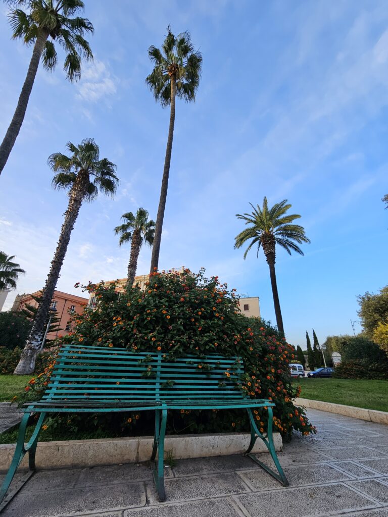 Turpinot iet pa ieliņām, nonākam pie- Belvedere Terazza, vēm mazliet uz priekšu, pilsētas pludmalē- “Lama Monachine”- cilvēki vēljoprojām ķer sauli, pludmale ir pilna. Mani protams priecē tas, ka ir atkal puķupodiņi un ziedi vijās ap katru ēku, kur vien var uzspraukties😊.