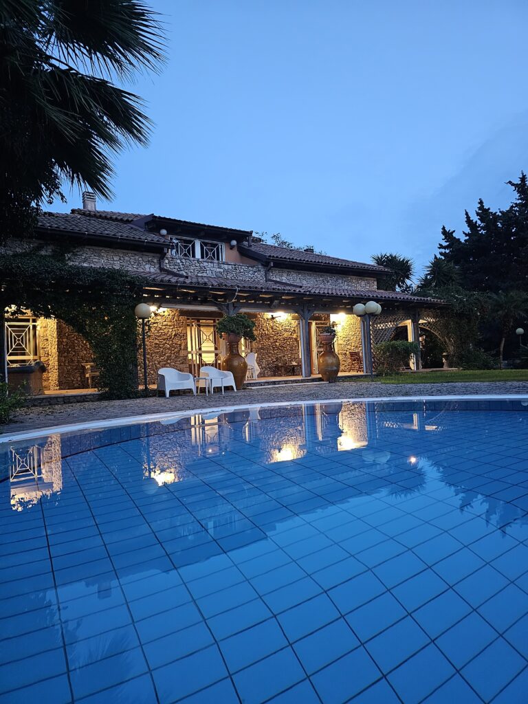 Tas tik bija pavērsiens, izbraucām no centra un klusākā nostūrī paliekam villā –“All’Ombra del Palmeto san Vito”. Aizbraucot, pašiem neticējās, skaista grezna vill, ar lielu dārzu un milzu Baseinu, tikai 56E par abiem. Visa istaba un sava vannas istaba, var izmantot virtuvi. Saimniece tik jauka, sagādāts gan ūdens, gan piens, kruasāni, cepumiņi, ievārījumi, tēja.
