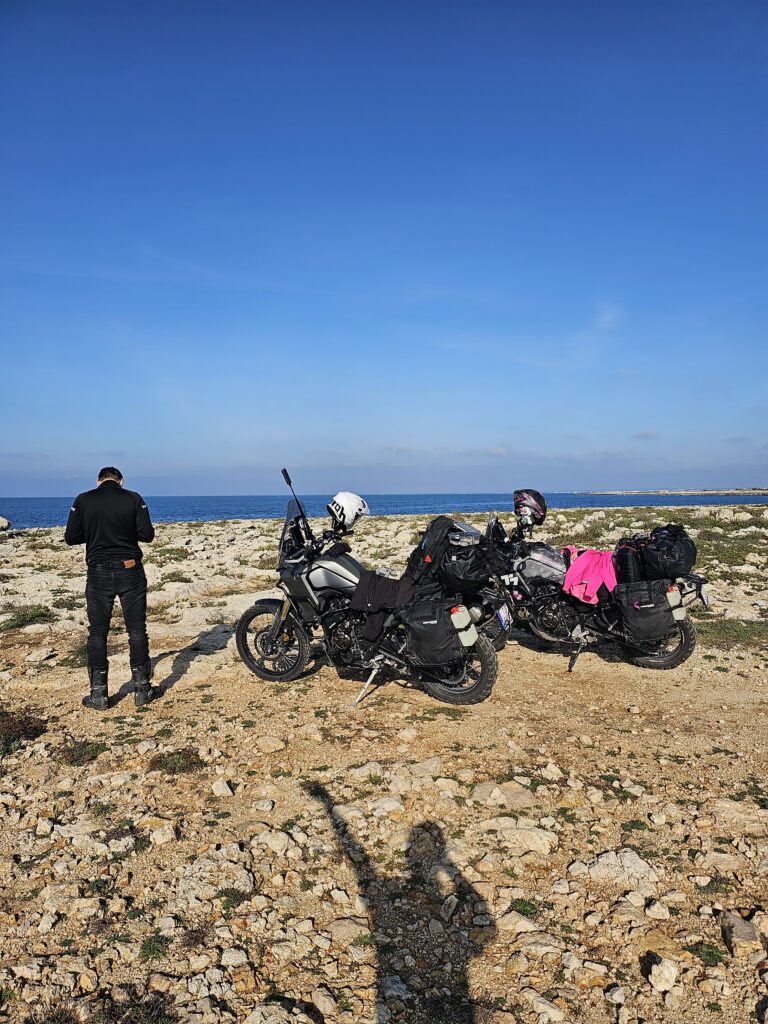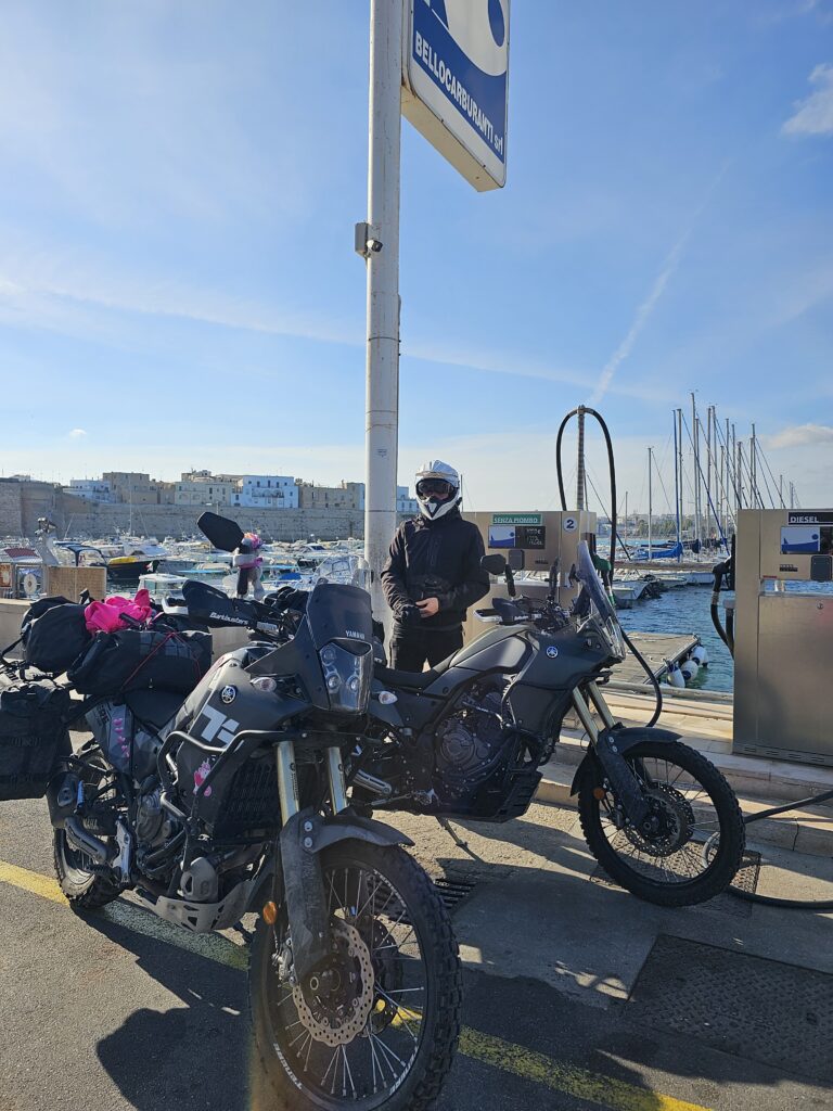 Mums ļoti patika braukt pa krastu, iztēlojāmies cik te daudz viesu ir siltākā sezonā, jo viesnīciņas bija viena pie otras, cita par citu greznākas. Bet tagad, pilnīgs klusums, viesnīciņu logi ciet, pludmalēs tikai smiltis, neviena lietussardziņa vai sauļošanās paklājiņa, pat jahtas , izskatās notauvotas ziemai. Pašiem vajadzēja uzpildīties …. smējāmies, jo atradām benzīntanku ostā, hei uzpildīsi manu laivu, jā un manējo Tenere 700 arī😊.