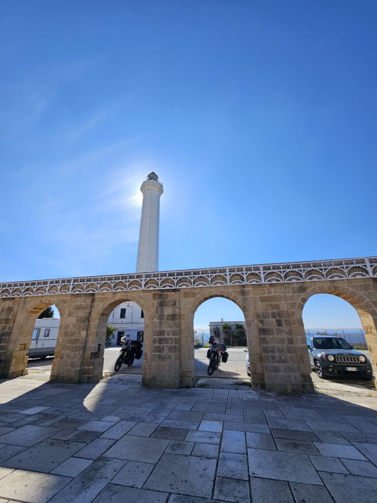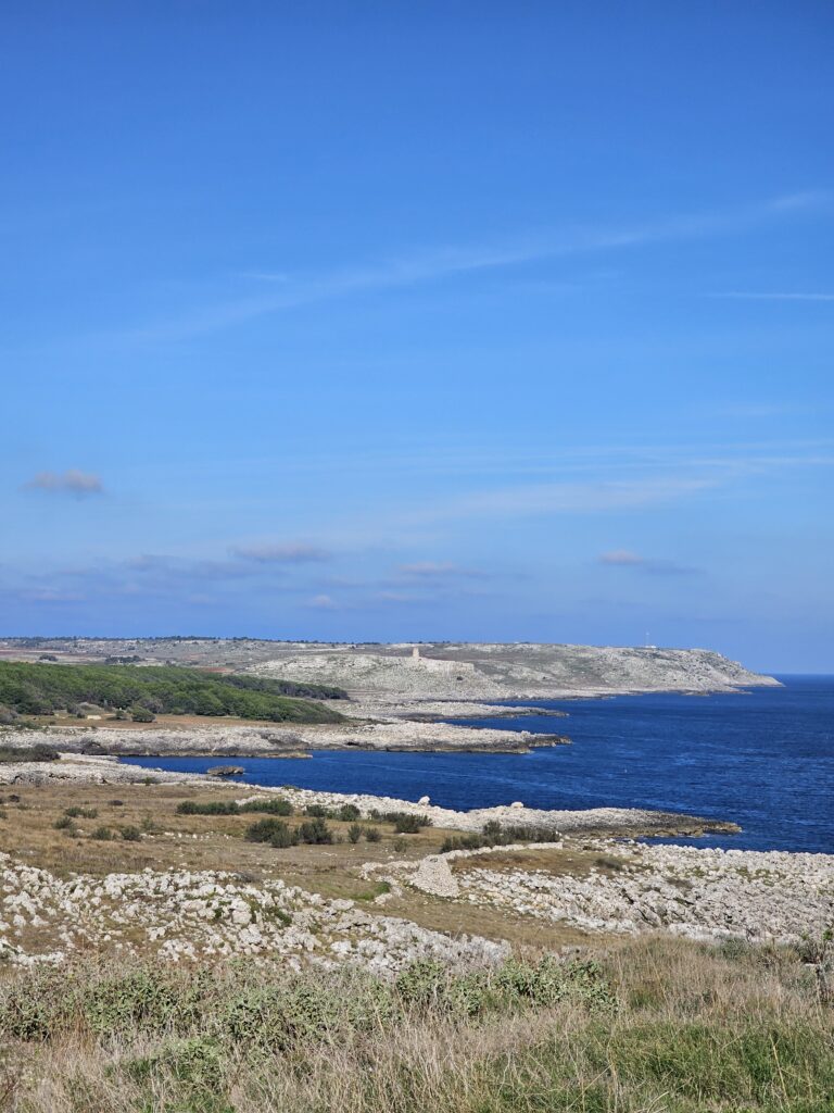 Tā nu pa krastu un papēža laukiem līkumojam līdz lejai. Brīžiem pārņem sajūta, ka pavisam aizmirsta tā leja, tad atkal saimniecība, pie saimniecības, dažādi ražas lauki un olīvkoku lauki, traktori braukā un laista, šur un tur mazie vēja ģeneratori. Esam pie pašas lejas maliņas, skaistā vietā “Santuario di Santa Maria de Finibus Terrae.