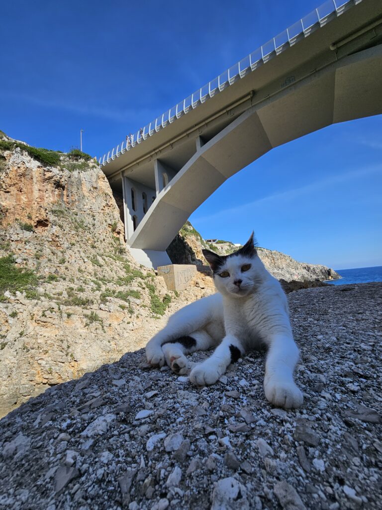 Ejam pa trepītēm paskatīties un kaķu draugs pie mums arī klāt. Jā ūdens tik zaļi zils, trakie jaunieši lec no klintīm iekšā ūdenī, slinkākie sauļojas, bet mēs priecīgi par ainavas salikumu. Tilts, kaķis, zaļi zils ūdens un smilškrāsas klintis, to visu apspīd koša saule, vaigos nemanāmi ir smaids un sildās sirds😊.