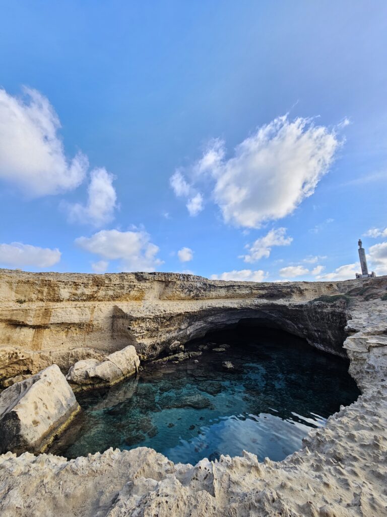 Ja jau esam stūrītī, tad izbrauksim visu papēža lejas maliņu. Lēnā garā, pa krastu līkumojam, apstājoties ik pa brītiņam ieelpot jūru un siltumu. Esam priecīgi par skaisto skatu, kas visu laiku mūs pavada, un skats mūs apstādina kādā krasta malā. Te jūra ielauzusies dziļāk klintīs, izveidojot slēpto pludmali.