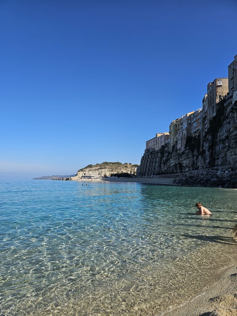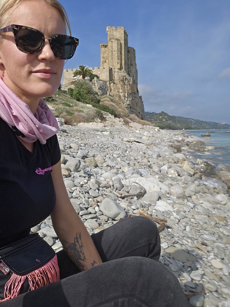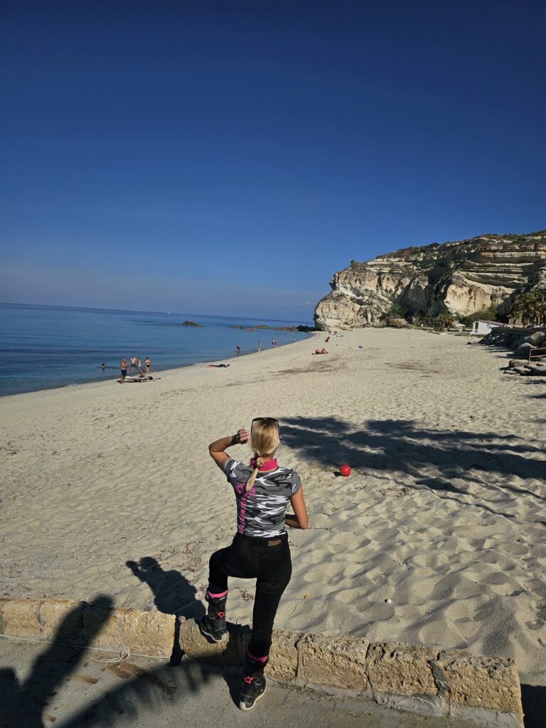 Un tad mēs nobraucām uz pludmali, mmm ūdens pilnīgi zaļš, tik tīrs un tik baltas smiltis, “Shore of Tropea”. Ceļš aizvijas gar krastu ar lielu līkumu, un ēku sienas ir kā nogriezta torte. Viss kopā ir tik labs skats. Sildos moto drēbēs saulītē un smaidu😊.