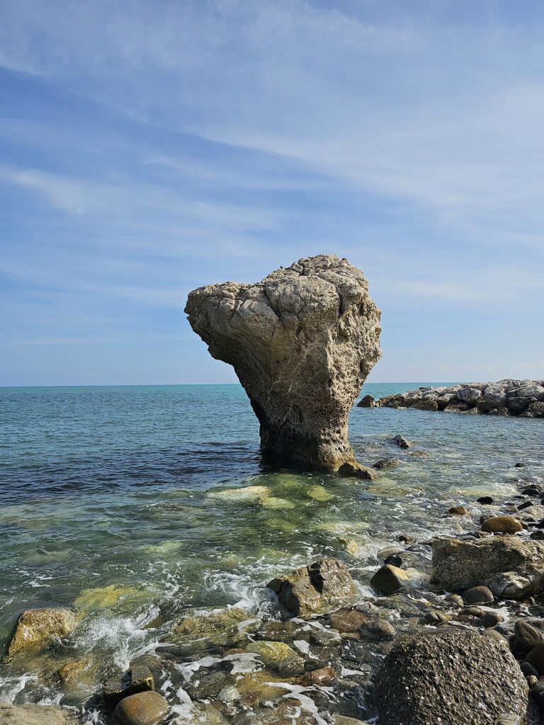 Te ūdenī ir dīvains akmens, ko sauc par LAKTU- “Scoglio dell Incudine”, šis skats bieži tiek izmantots suvenīros un ir spilgta pazīme vietējai apkārtnei. Vispār jau braucot šo ceļa posmu bija daudz ovāciju, redzējām skaistas pilis un skatus no ceļa. Tad nu nedaudz te pasauļojāmies un devāmies kalnos, apkārtnē- “Parco Nazionale del Pollino”.
