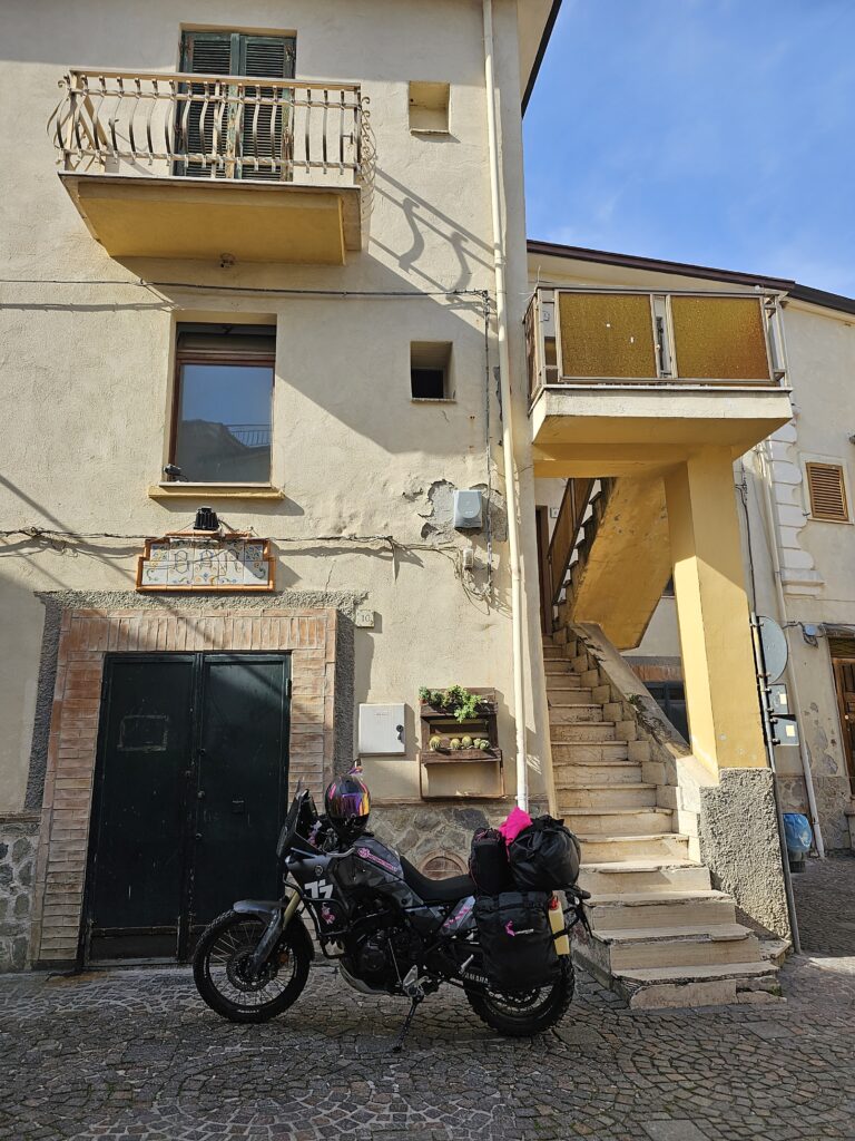 Meklēju naktsmājas, jo tumsa pēc minūtēm jau klāt, bet vispār neko kartē neatrodu. Tad pieripina vietējie un ar kārtīgu akcentu, aiziet Itāliski. Atkal mani pieci itāļu vārdi noder. Saprotu, ka viņi jautā vai palīdzēt atrast kur palikt. Un izstāstu, ka mums vajag kur gulēt. Tad nu tiek sarunāts vietējais draugs, kas mūs gaidīs. Izstāsta čalis mums ceļu un dažus km atpakaļ mūs gaida viesu namā viņa čoms.