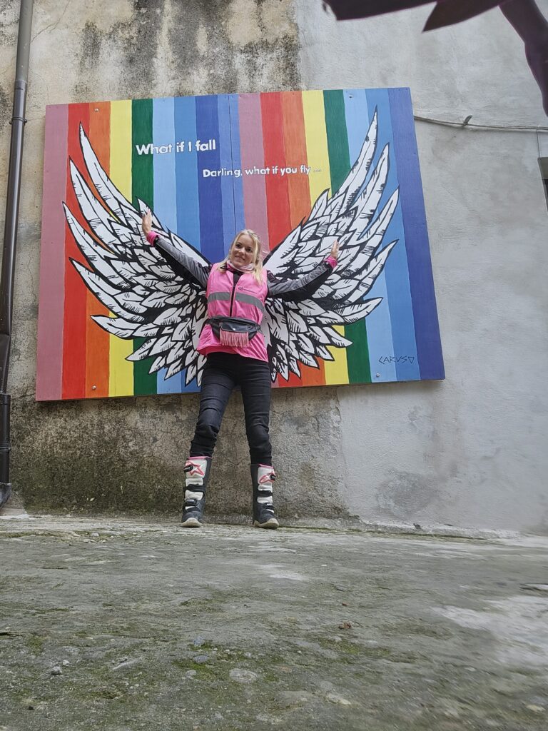 Šodien ar gaismiņu nolemju, jāatrod pilsētiņā tās mazās ieliņas ar skaistajiem zīmējumiem. Un rīts gudrāks par vakaru, mazliet vajadzēja pacensties un izdevās – “I Murales di Giuseppe Caruso”. Tā ir tik krāsu pilna vieta, tik koša, tik pavasarīga. VICO LEONE ieejot šajā mākslas alejā jūs jutīsities gaidīti. Priecīga par krāsu pielieto rītu un mazliet satraukta, ka sapinos, apmaldījos labirintā un pilsētiņas ielu stāvos, beigās atrodu ceļa biedru un motociklus😊, varēja doties tālāk.