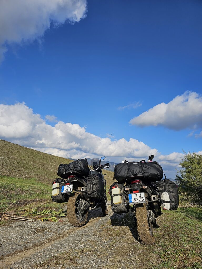 Nu vajag pamēģināt, jo kartē jau ceļš ir un izved uz to pusi kur gribam tikt. Vēl jau tikai dienas pusē, nu mēģināsim. Kādu gabaliņu tikām, tad bija bez ceļš, tad vispār nav, sākās rises un akmeņi, viss bija izmircis un dubļos. Motociklu pumpainās riepas pārvērtās par slēpēm un tā mēs tur airējām, līdz es biju gar zemi😊.