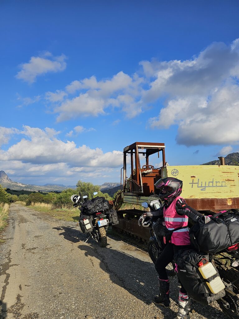 Izkūlāmies no tās zaptes ārā, motocikli skaisti un paši arī. Atradām pamestu ekskavatoru, sataisījām foto sesiju, ievilkām krūtīs skaisto apkārtnes skatu, tā mazu brīdi atpūtušies varējām doties ceļā. Tālāk gan pa mazajiem, asfaltētajiem, jo tāpat jau laukos paliksim😊. Mums ļoti patika- te bija plaši olīvu lauki, milzīgi kaktusu dārzi un nebeidzams horizonts😊.