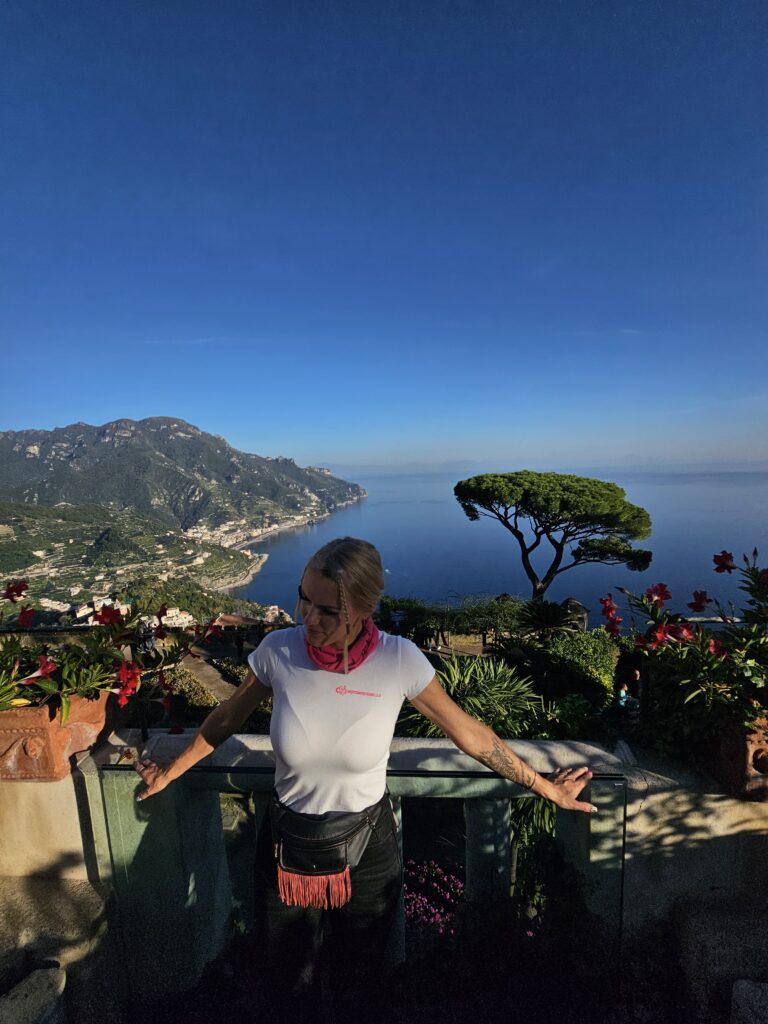Aizbraucām uz “Villa Rufolo” Ak mans dievs, es esmu puķu meitene, kāds tur dārzs, es jau aizmirsu, ka man karsti, ka sastrēgumi. Es biju pārņemta ar to skaistumu, ziediem un dārzu, brīžiem nevarēja saprast vai citi apskatās mani vai objektus. Bet ja man ir emocijas, tad ir nu es nevaru tā, paskatījos, smuki, ok. Būs Uh un Ah un Wow un Paradīze un Smaids līdz matu galiņiem. Vietiņa man, tik burvīgi. Galvenais ņemat vērā, ka šīm vietām ir darbalaiks, protams ieejas maksa. Pats svarīgākais, te ir maz vietas un arī motociklu stāvvietas ir maksas, novietojam, aizejam aparātiņā samaksāt un pieliek biļeti. Visu laiku dežurē stāvvietas darbiniek ar somiņām, var sanākt ne visai labs pārsteigums, ja paši nebūsiet rūpīgi.