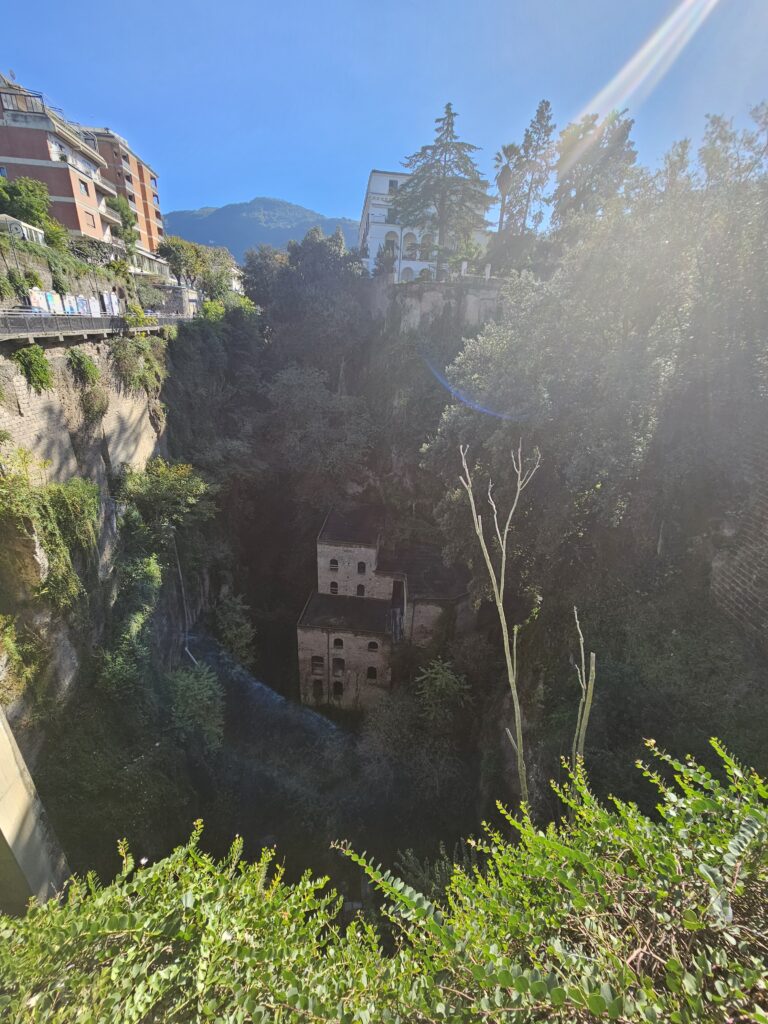 SORRENTO pilsētu mēs izstaigājām pamatīgi. Nolikām mocīšus, interesantā, šaurā, šķībā, bruģētā ieliņā un ērtās drēbēs saģērbušies, aiziet. Te man bija svarīga misija, atrast “Vallone dei Mulini”, jo pamestas vietas ir mana vājība, vēl jo vairāk, kad tā ir pilsētas vidū. Ēka, kas ir uz leju milzu zaļā ielejā, kur ir bruģētas ūdens teces, ne jausmas kā tur iekļūt vai nokļūt.